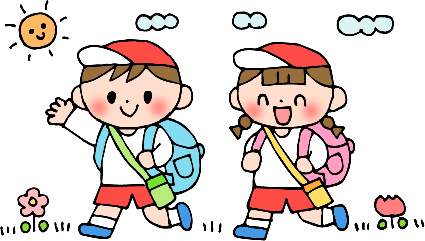 遠足 園児 男の子 女の子 リュック 水筒 太陽 くも 雲 花 チューリップ 草 リュックサック おさんぽ お散歩 さんぽ おでかけ お出かけ 散歩 ともだち なかよし