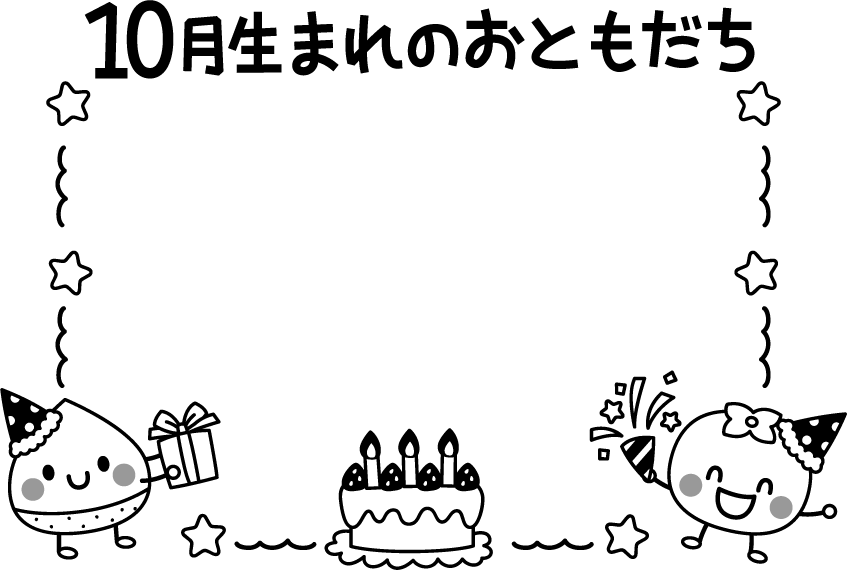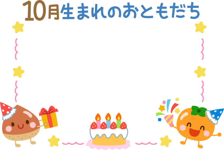 10月生まれのおともだち 10月生まれのお友達 10月生まれのお友だち 10月 誕生日 誕生日ケーキ ケーキ ロウソク いちご イチゴ 苺 プレゼント クラッカー 星 カキ かき 柿 食べ物 果物 フルーツ くり クリ 栗 秋フレーム 帽子