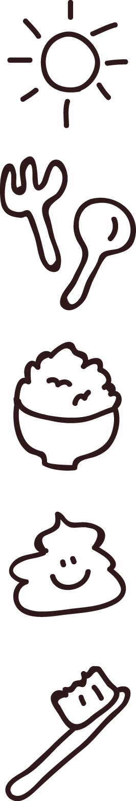 朝 ルーティーン 早寝 早起き 歯ブラシ はみがき 太陽 うんち 便 ごはん 朝ごはん えんそく おべんとう 遠足 お弁当
