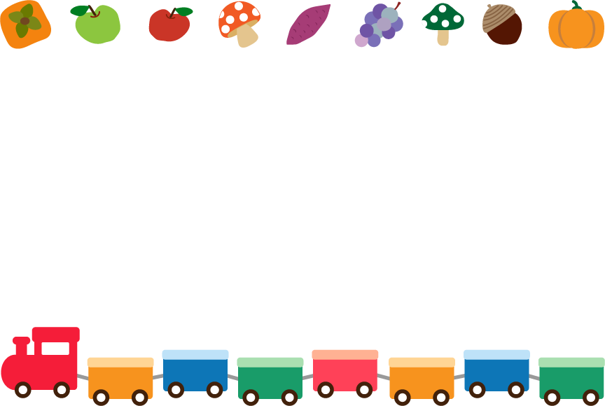 10月 9月 ブドウ ぶとう サツマイモ 焼き芋 きのこ キノコ なし 梨 りんご リンゴ 柿 ぶとうカキ 秋の味覚 乗り物 機関車 きしゃ 列車 幼稚園 保育園 おもちゃ 玩具 電車 積み木 つみき 秋フレーム