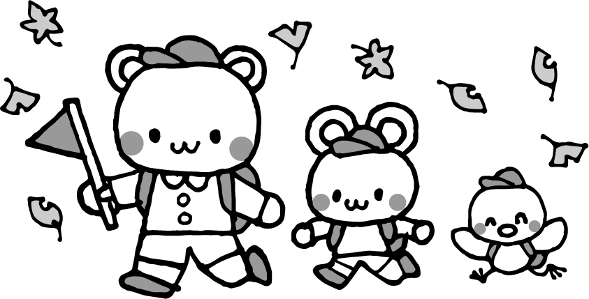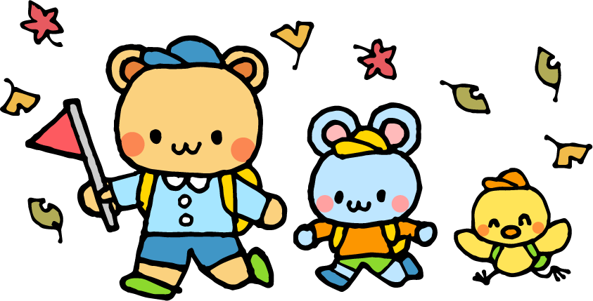 旗 リュック 帽子 ヒヨコ ひよこ 鳥 とり ネズミ ねずみ 熊 クマ くま 動物 秋の遠足 遠足 紅葉 もみじ イチョウ 葉っぱ 落ち葉 おさんぽ お散歩 さんぽ おでかけ お出かけ 散歩 生きもの いきもの 生き物