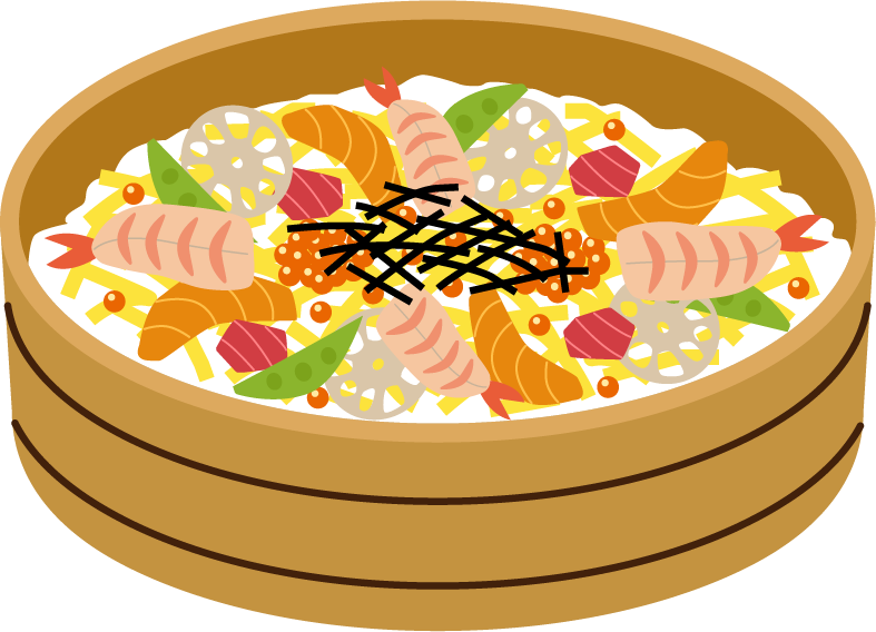 園だより お知らせ メニュー お寿司 すし 五目寿司 食べ物 食育 ひな祭り 誕生日 お祝い パーティー 桶 えび エビ 海老 サケ サーモン 鮭 まぐろ マグロ 卵 錦糸卵 のり 海苔 いくら イクラ レンコン れんこん 豆 きぬさや