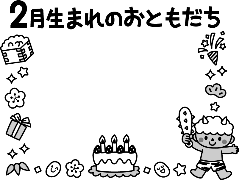 保育園 幼稚園 こども園 園だより お誕生日会 誕生日会 お誕生会 誕生会 お誕生日 誕生日 誕生日ケーキ クラッカー プレゼント 星 キラキラ 2月生まれのお友達 2月生まれのおともだち 2月 2月 節分 豆まき 金棒 鬼 赤鬼 おに オニ 豆 松 花 梅