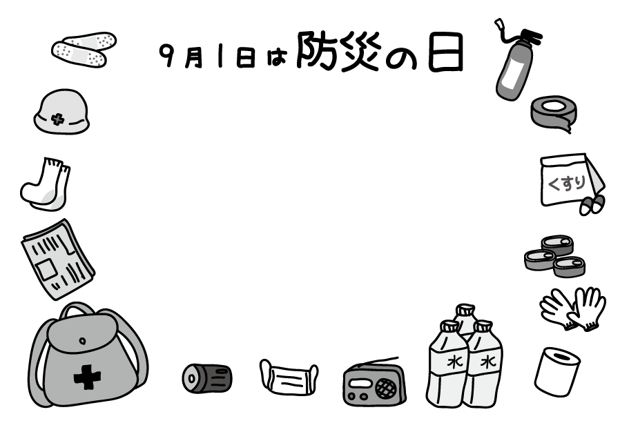 防災訓練 地震 備え 消防 訓練 9月1日 被災 ガムテープ 軍手 リュック 水 懐中電灯 ラジオ 消火器 絆創膏