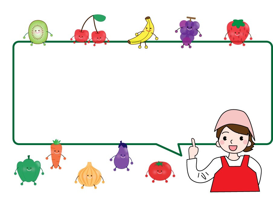 食育 果物 野菜 メニュー 給食だより お便り キウイ サクランボ イチゴ ブドウ バナナ 玉ねぎ ピーマン トマト ニンジン なすび 給食