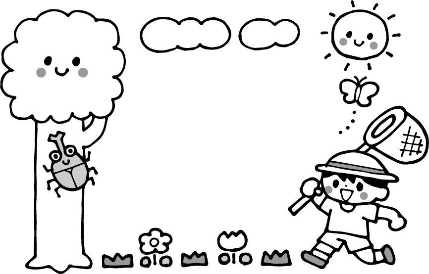 虫取り 網 男の子 虫 カブト虫 カブトムシ 太陽 雲 草 木 花 チューリップ ちょうちょ チョウチョ 蝶 帽子 夏フレーム