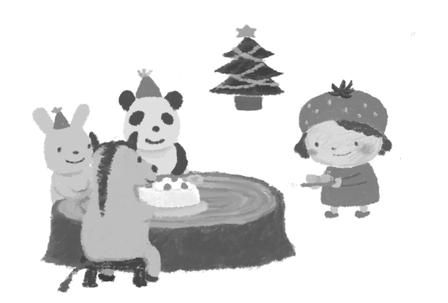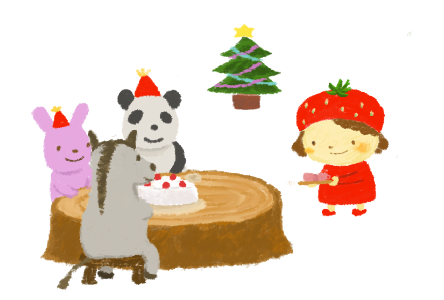 イチゴ 12月25日 えんだより お便り 12月 冬のイベント パンダ うさぎ ウマ ツリー ケーキ 丸太の机