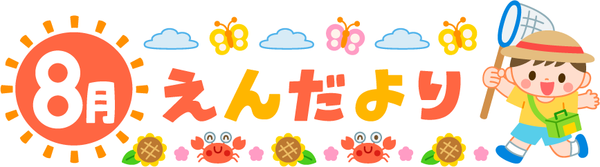 8月 8月 園だより 太陽 雲 晴れ 天気 くも ちょうちょ チョウチョ 蝶 虫取り 虫取りかご 虫取り網 園児 子ども こども 男の子 かに 蟹 カニ 花 ひまわり ヒマワリ 向日葵 帽子