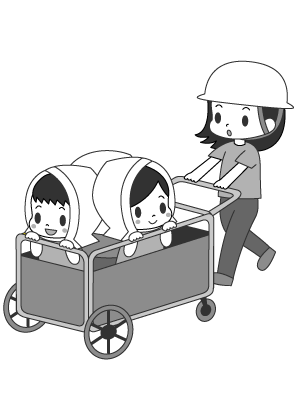 防災訓練 避難訓練 ベビーカート 乳母車 お散歩カート おさんぽカー 防災頭巾 避難 避難車 カート 保育園 幼稚園 こども園 園だより えんだより 園児 こども 子ども 子供 男の子 女の子 保育士 女性 防災の日 防災