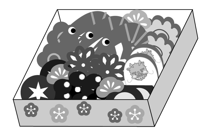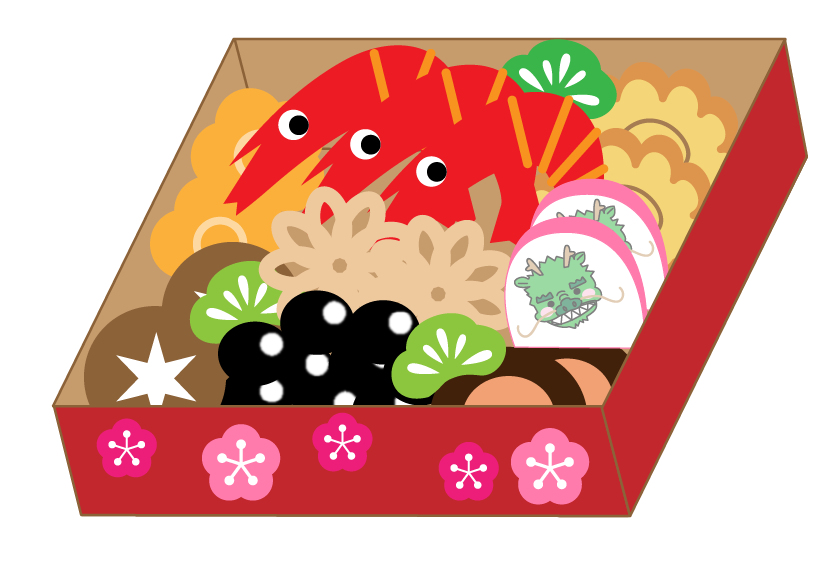 おせち おせち料理 お正月 新年 辰 たつ年 えんだより お便り 手紙 えび かまぼこ 黒豆 しいたけ 煮しめ にんじん 伊達巻