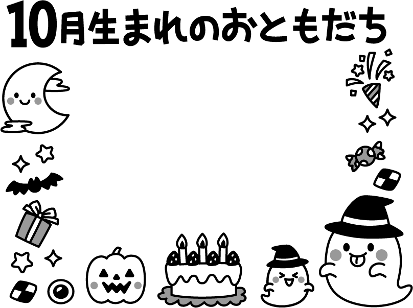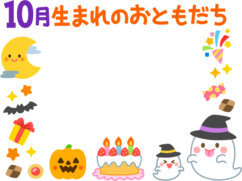 保育園 幼稚園 こども園 園だより お誕生日会 誕生日会 お誕生会 誕生会 お誕生日 誕生日 誕生日ケーキ クラッカー プレゼント 星 キラキラ 月生まれのお友達 10月生まれのおともだち 10月 10月 ハロウィン おばけ オバケ お菓子 クッキー あめ アメ 飴 食べ物 コウモリ 動物 カボチャ かぼちゃ 南瓜 パンプキン 月 三日月 くも 雲