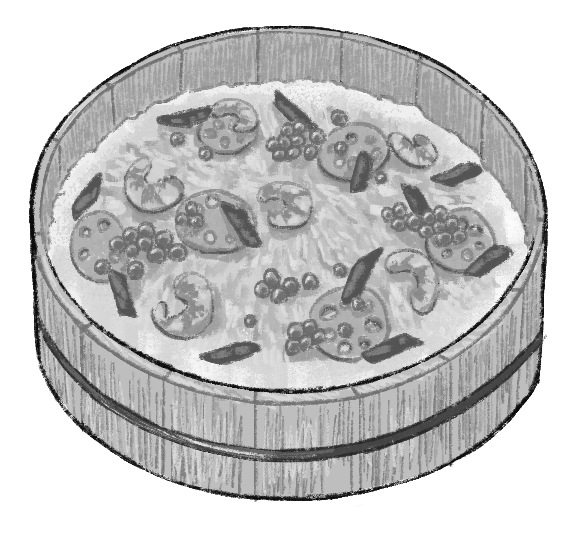 きぬさや 豆 れんこん レンコン イクラ いくら 錦糸卵 卵 マグロ まぐろ 鮭 サーモン サケ 海老 エビ えび 桶 パーティー お祝い 誕生日 ひな祭り 食育 食べ物 五目寿司 すし お寿司 メニュー お知らせ 園だより