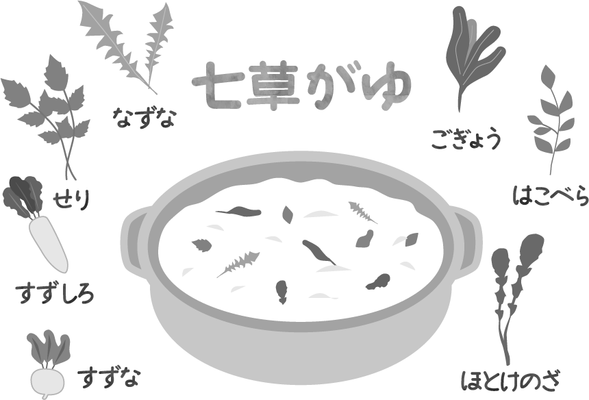 園だより 掲示板 春の七草 春の 七草粥 七草 1月7日 節句 無病息災 習慣 おかゆ セリ ナズナ ゴギョウ ハコベラ ホトケノザ スズナ・ スズシロ せり なずな ごぎょう はこべら ほとけのざ すずな すずしろ リクエスト