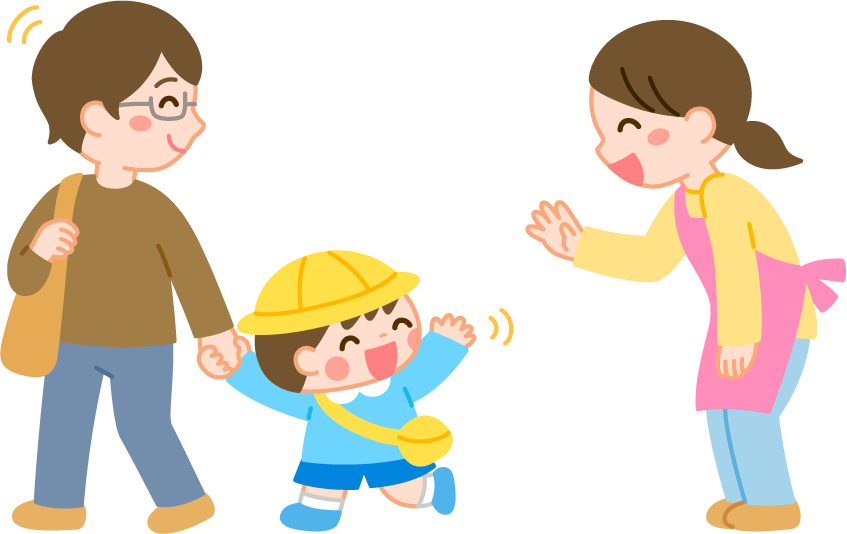 保育園 幼稚園 こども園 園だより えんだより 降園 先生 保育士 園児 男の子 こども 子ども 子供 ばいばい バイバイ さようなら 女性 保護者 おとうさん お父さん 父親 親子 お迎え あいさつ 挨拶 リクエスト