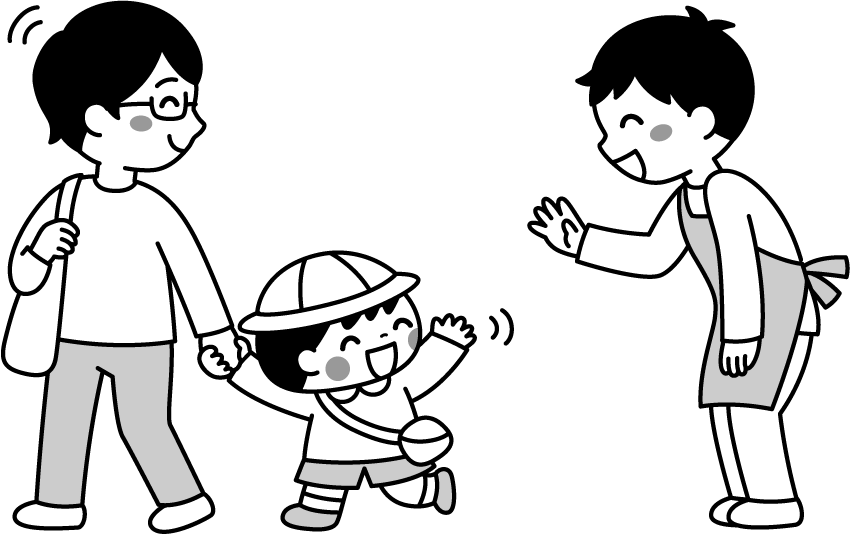 保育園 幼稚園 こども園 園だより えんだより 降園 先生 保育士 園児 男の子 こども 子ども 子供 ばいばい バイバイ さようなら 男性 保護者 おとうさん お父さん 父親 親子 お迎え あいさつ 挨拶 リクエスト