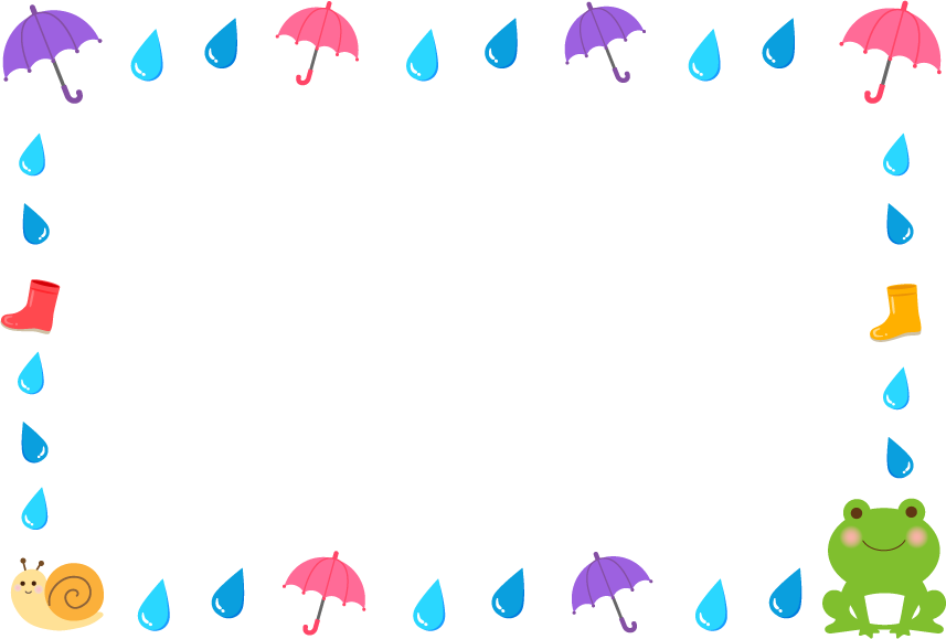 園だより お知らせ あめ 梅雨 梅雨ライン つゆ しずく 雫 水滴 雨 傘 かさ カサ 長靴 ながぐつ 蛙 カエル カタツムリ かたつむり 6月 6月