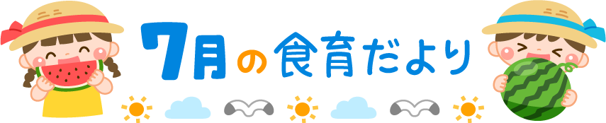 保育園 幼稚園 こども園 園だより えんだより タイトル 7月 7月 しょくいくだより 食育だより 食育 園児 こども 子ども 子供 男の子 女の子 食べ物 くだもの 果物 フルーツ 旬 旬の食材 旬の果物 リクエスト すいか スイカ 麦わら帽子 帽子 動物 鳥 トリ とり 鴎 カモメ かもめ くも 雲 太陽