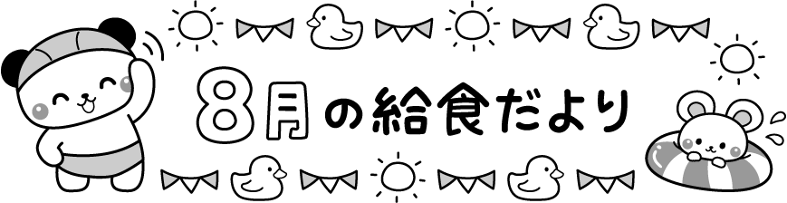 保育園 幼稚園 こども園 園だより えんだより タイトル きゅうしょくだより 給食だより 給食 食育 8月 8月 プール うきわ 浮き輪 浮輪 水着 太陽 あひる アヒル とり トリ 鳥 動物 ぱんだ パンダ ねずみ ネズミ 鼠 水泳 旗 フラッグ