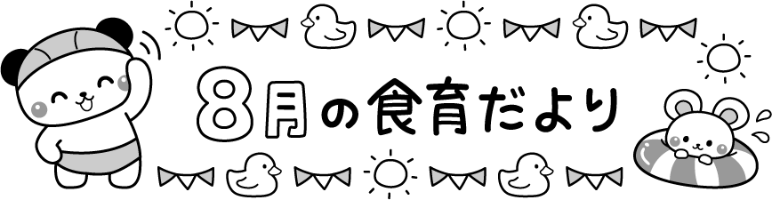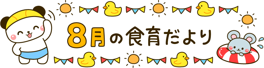 保育園 幼稚園 こども園 園だより えんだより タイトル しょくいくだより 食育だより 食育 8月 8月 プール うきわ 浮き輪 浮輪 水着 太陽 あひる アヒル とり トリ 鳥 動物 ぱんだ パンダ ねずみ ネズミ 鼠 水泳 旗 フラッグ