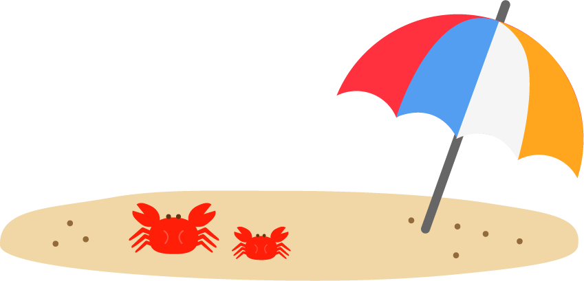 園だより かに カニ 蟹 ぱらそる パラソル 傘 かさ カサ はまべ 海辺 うみべ 砂浜 すなはま 砂 海 うみ 海水浴