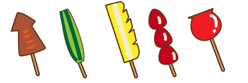 りんごあめ きゅうりの浅漬け 冷え冷えキュウリ イチゴ飴 イカ焼き パイン パイナップル カットフルーツ フルーツ 屋台フード 屋台スイーツ お祭り お便り お楽しみ会 夜店