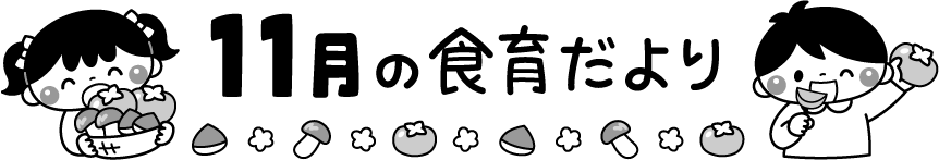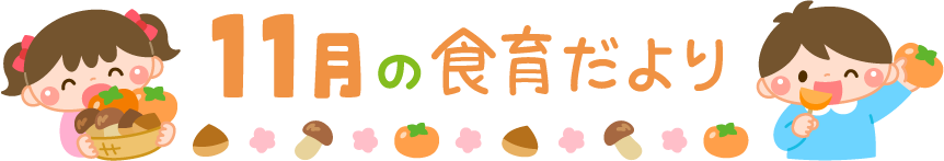 保育園 幼稚園 こども園 園だより えんだより タイトル しょくいくだより 食育だより 食育 園児 こども 子ども 子供 男の子 女の子 秋の味覚 かき カキ 柿 くだもの 果物 まつたけ マツタケ 松茸 きのこ キノコ 茸 くり 栗 11月 11月 リクエスト