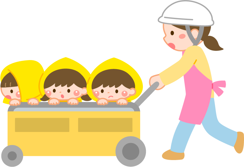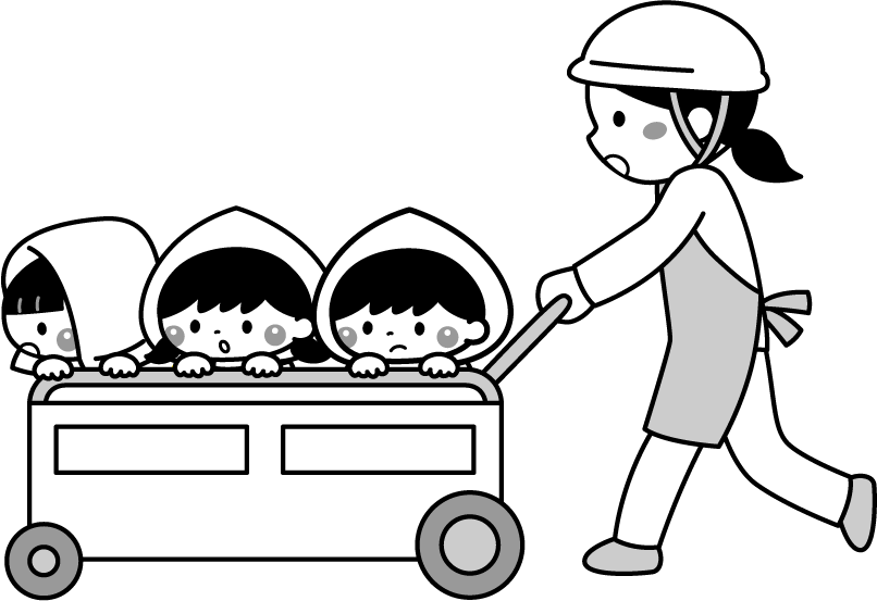 防災訓練 避難訓練 ベビーカート 乳母車 お散歩カート おさんぽカー 防災頭巾 避難 避難車 カート 保育園 幼稚園 こども園 園だより えんだより 園児 こども 子ども 子供 男の子 女の子 保育士 女性 防災の日 防災