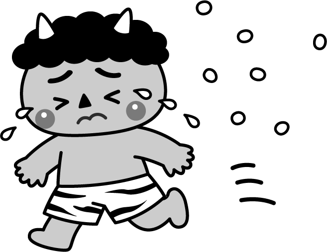 保育園 幼稚園 こども園 園だより えんだより リクエスト 節分 豆まき まめまき 豆撒き うた 歌 まめ 豆 マメ 歌イラスト おに オニ 鬼 赤鬼 鬼はこっそり逃げていく おにはこっそりにげていく 泣いてる鬼