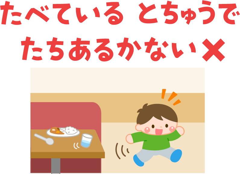 保育園 幼稚園 こども園 園だより えんだより 園児 こども 子ども 子供 男の子 リクエスト お店の中でやってはいけないこと お店 店 飲食店 レストラン ファミレス マナー 食事 食事のマナー 注意 禁止 カレーライス カレー 立ち歩かない たちあるかない 食事中に立ち歩かない うろうろしない 食べている途中で立ち歩かない 座って食べましょう あるく 歩く たつ 立つ