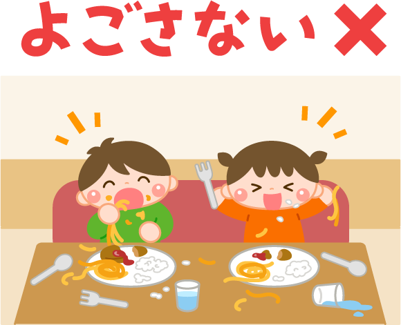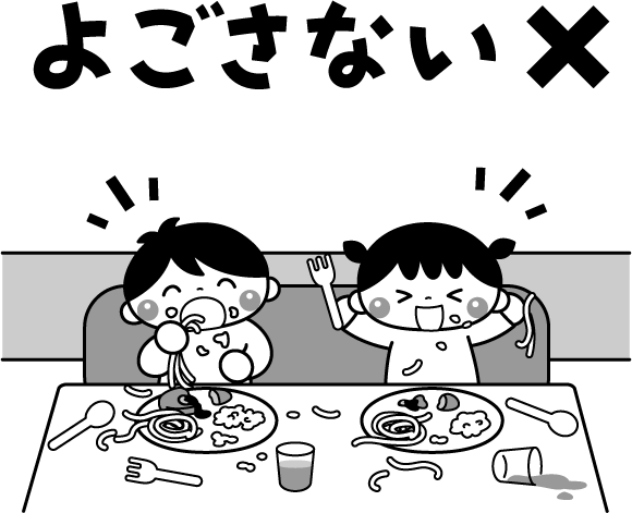 保育園 幼稚園 こども園 園だより えんだより 園児 こども 子ども 子供 男の子 女の子 リクエスト お店の中でやってはいけないこと お店 店 飲食店 レストラン ファミレス マナー 食事 食事のマナー 注意 禁止 ハンバーグ パスタ スパゲッティ スパゲッティー ご飯 ごはん 外食 よごさない 汚さない 綺麗に食べる きれいに食べる